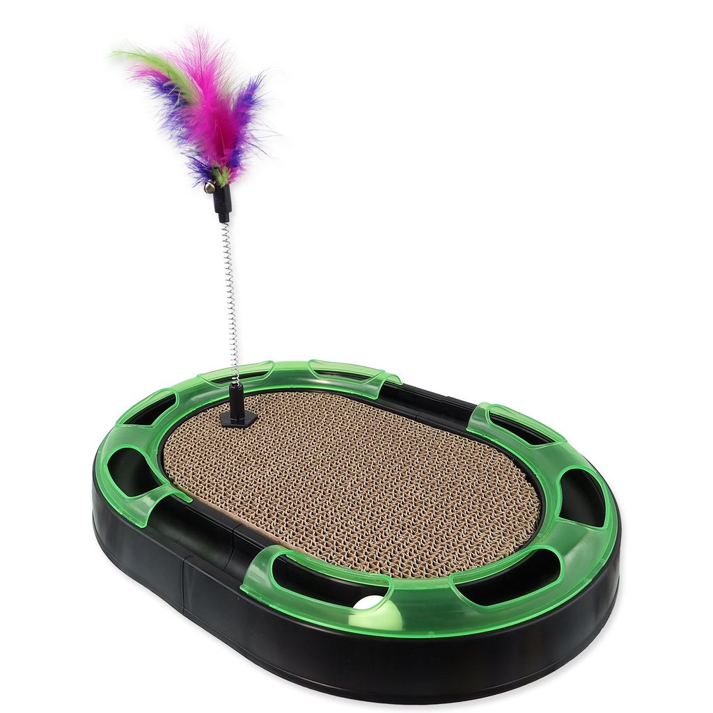 Interkativní zábavné škrabadlo pro kočky s koulodráhou a pružinou s pírky.