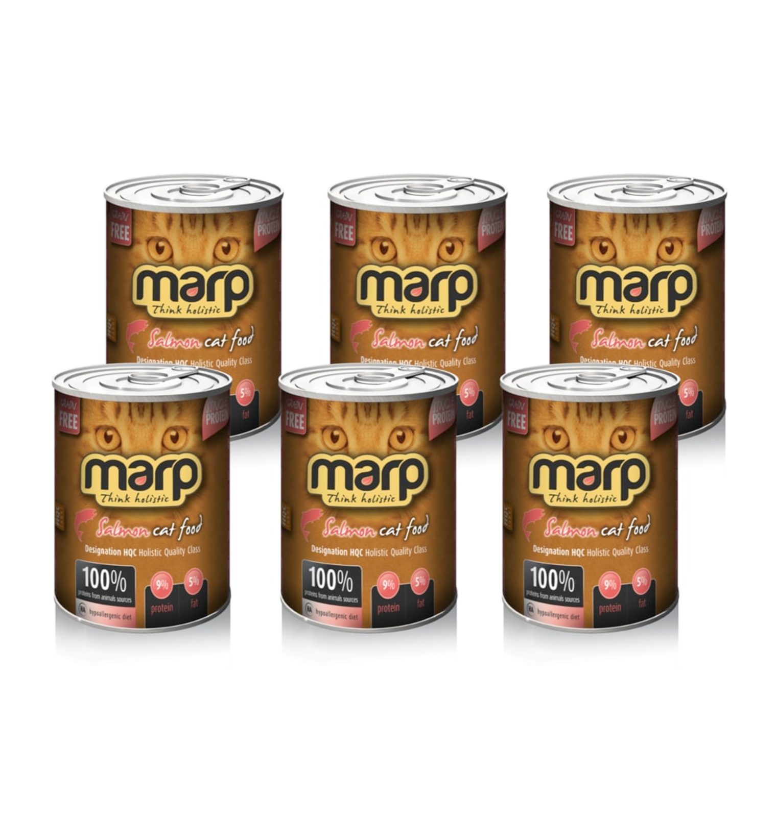 Víme, že kočka je masožravec a proto ji jako takovou ctíme. Konzervy Marp Pure obsahují 100% bílkovin ze živočišných zdrojů. Obsahují pouze maso, vnitřnosti, vývar a minerály. Nepoužíváme žádné umělé konzervanty, barviva, plnidla apod. a jsou vždy bez jakýchkoliv obilovin. Konzerva Marp s lososem bez obilovin je vhodná i pro kočky s citlivým zažíváním a dle našich zkušeností je velmi vhodná i pro kočky s potravními alergiemi.