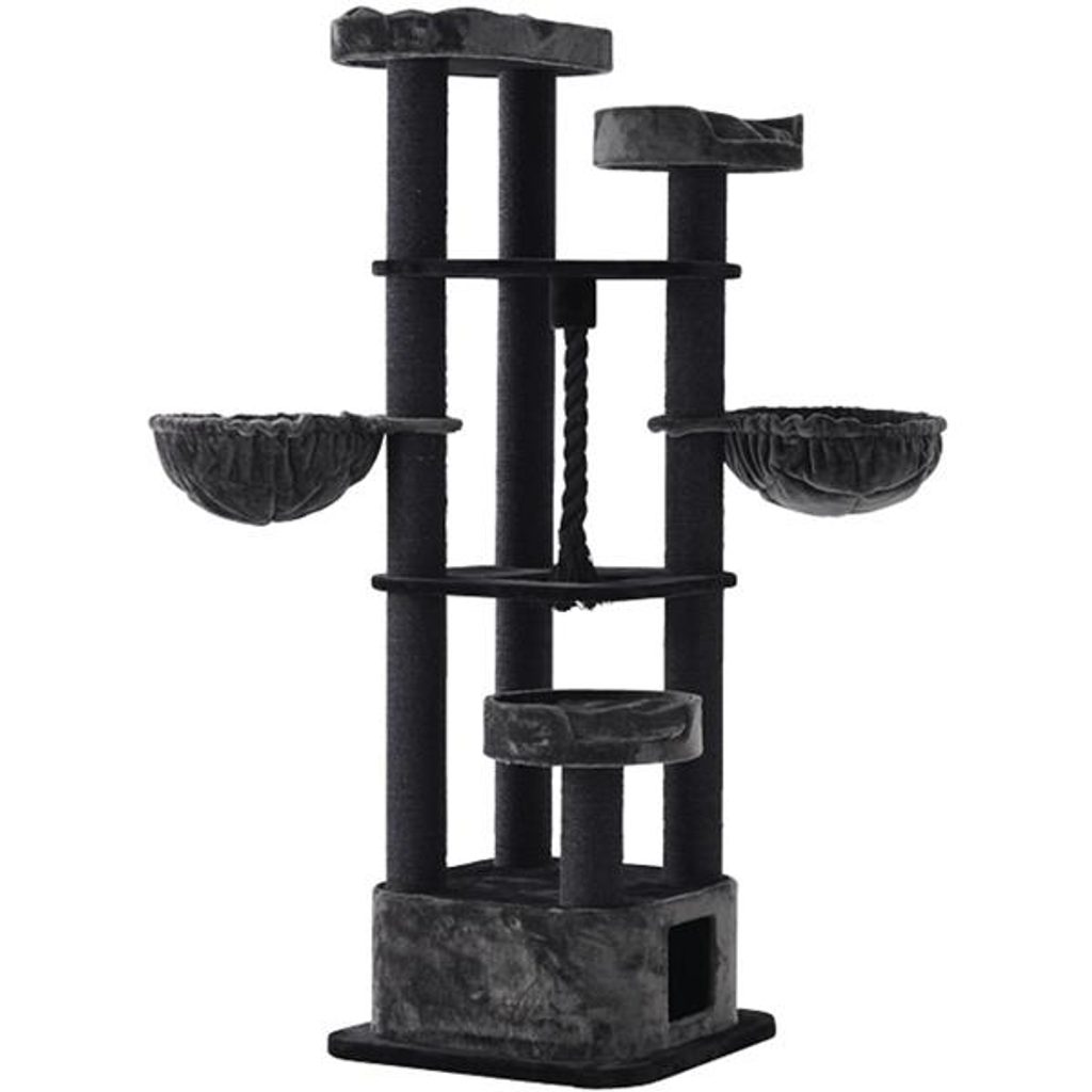 Vícepatrové stromové škrabadlo Musan pro kočky v černé barvě a sisalovým kmenem. Plošiny a budka jsou kompletně potaženy látkou.