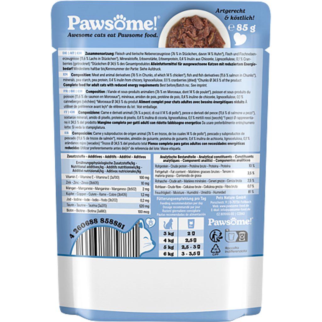 Šťavnaté kousky v lahodné omáčce, s lososem a sušenými brusinkami. Kompletní krmivo se sníženým obsahem kalorií, obohaceno o taurin a čekankový inulin. Vhodné pro dospělé kočky s nižšími energetickými nároky. Neobsahuje obiloviny ani přidaný cukr. Šťavnaté