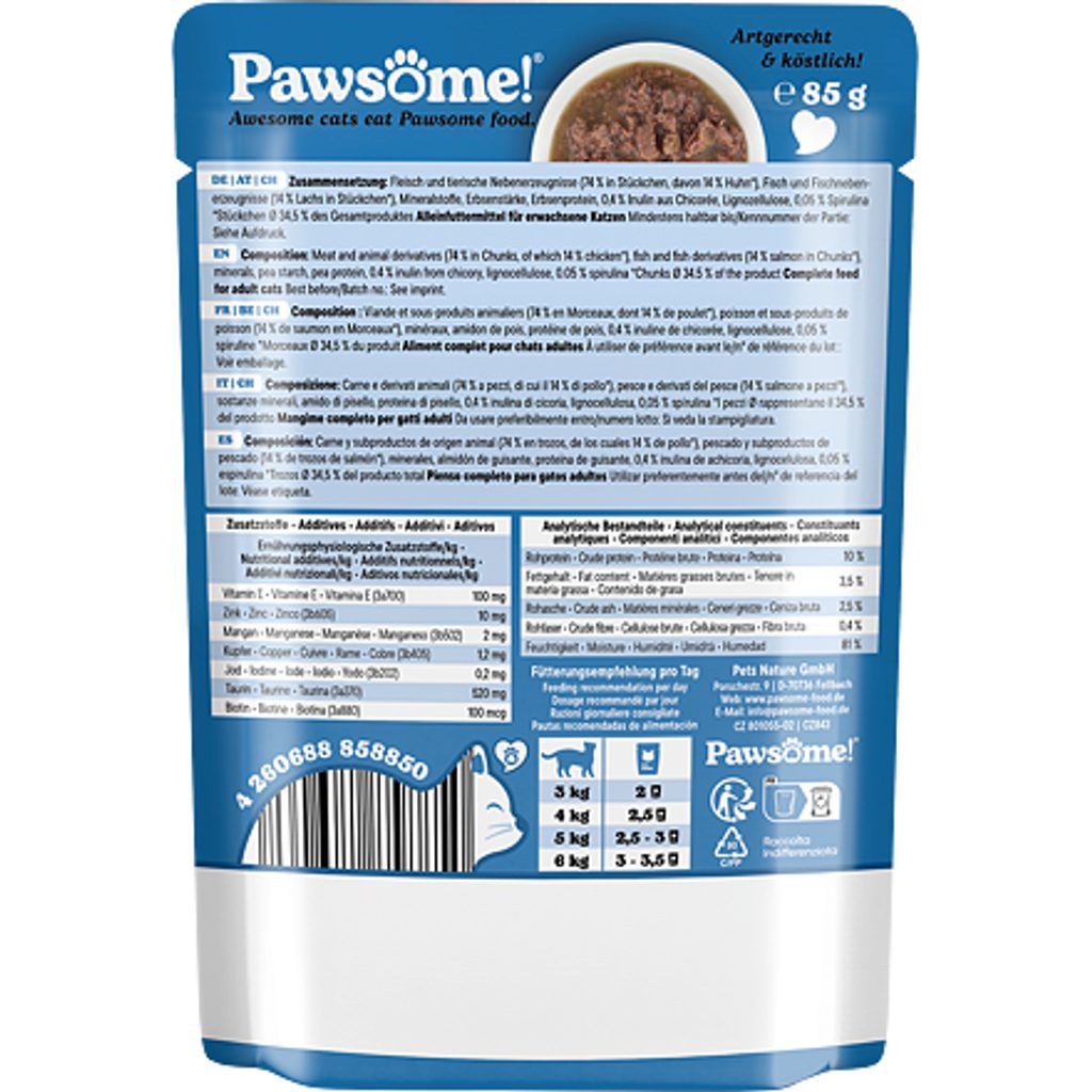 Šťavnaté kousky v lahodné omáčce s lososem a spirulinou představují kompletní krmivo pro dospělé kočky všech plemen. Obohaceno o taurin a čekankový inulin. Neobsahuje obiloviny ani přidaný cukr. Šťavnaté