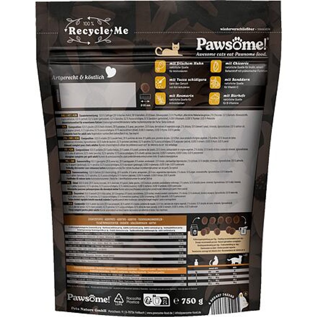 Bezobilné granule pro kočky s čerstvým kuřecím masem a tuňákem, obohacené o bylinky a superpotraviny jako jsou spirulina, čekanka, lososový olej a další funkční ingredience, které přirozeně podporují zdraví koček. Vhodné pro dospělé kočky všech plemen. Krmivo