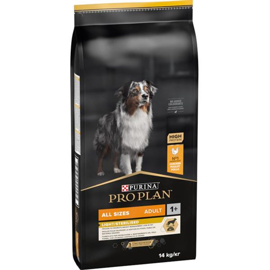 Pro Plan Dog Adult ALL SIZES Light/Sterilised kuře 14 kg Někteří psi jsou náchylnější k přibírání na váze, ať už v důsledku nižší aktivity nebo kastrace. My ale chceme, aby všichni psi vedli zdravý a spokojený život. Proto naši veterináři a odborníci na výživu vyvinuli PRO PLAN® Light/Sterilised – krmivo pro psy, které díky vyvážené stravě pomáhá udržet optimální hmotnost psa. Hlavní složkou krmiva Purina PRO PLAN® Light/Sterilised jsou kousky vysoce kvalitního kuřecího. Granule mají také upravený obsah bílkovin a tuků. Nižší podíl tuku podporuje hubnutí, úbytek tělesného tuku může dosáhnout až 60 % během 12 týdnů. Optimální hmotnost pak pomáhá udržet nejen každodenní vycházka, ale také vysoký obsah bílkovin a nízký podíl tuku. V kombinaci s každodenními procházkami podporuje snížení až 60 % tělesného tuku během 12 týdnů a udržení ideální hmotnosti díky vysokému obsahu bílkovin a nízkému obsahu tuku. Toto promyšleně navržené krmivo pro psy snižuje pocit hladu, obsahuje totiž vysoké množství bílkovin, komplexní zdroje sacharidů a také dostatečný objem vlákniny. Krmivo Purina PRO PLAN® Light/Sterilised ALL SIZE ADULT bylo vyvinuto pro dospělé psy všech plemen. Granule obsahují vitamín D, minerální látky a specifické množství omega-3 mastných kyselin (0,3 %), které přispívají ke zdraví zubů a dásní. Krmivo má vysoký podíl kuřecího a splňuje nároky na optimální výživu psů od 12 měsíců věku. Objevte výhody, které má řada Light/Sterilised pro zdraví a pohodu vašeho psa. Toto krmivo je vhodné nejen pro psy, kteří potřebují upravit váhu, ale také pro vykastrované psy a feny. Benefity: Hlavní složka kuře, vysoký podíl bílkovin Prokazatelně napomáhá snížení hmotnosti Nízký obsah tuku přispívá k hubnutí a udržení žádoucí tělesné hmotnosti Pomáhá snižovat pocit hladu Vědecky ověřená výživa bez přidaných barviv Složení: kuře (15 %) (včetně hřbetu a hrudi), pšenice, sušené drůbeží bílkoviny, kukuřice, rýže (9 %), sušená řepná dužina, sójová mouka, dochucovací masové výtažky, moučka z kukuřičné bílkoviny, kukuřičná krupice, pšeničný lepek, minerální látky, rybí tuk, živočišné tuky. Doplňkové látky: Nutriční doplňkové látky: m.j./kg: vit A: 37 000; vit D3: 1 200; vit E: 550; mg/kg: vit C: 120; síran železnatý monohydrát: (Fe: 140); jodičnan vápenatý bezvodý: (I: 2,2); síran měďnatý pentahydrát: (Cu: 15); síran manganatý monohydrát: (Mn: 52); síran zinečnatý monohydrát: (Zn: 130); seleničitan sodný: (Se: 0,15). Doplňkové látky: Nutriční doplňkové látky: m.j./kg: vit A: 37 000; vit D3: 1 200; vit E: 550; mg/kg: vit C: 120; 3b103: (Fe: 140); 3b202: (I: 2,2); 3b405: (Cu: 15); 3b503: (Mn: 52); 3b605: (Zn: 130); 3b801: (Se: 0,15). Doplňkové látky: Technologické doplňkové látky: mg/kg: 1b306i: 5. Doplňkové látky: Technologické doplňkové látky: mg/kg: tokoferolové extrakty z rostlinných olejů: 5. Analytické složky: protein: 27,0 %, obsah tuku: 9,0 %, obsah anorganických látek: 7,5 %, hrubá vláknina: 3,5 %, taurin: 0,1 %. Krmný návod: viz tabulka doporučených denních krmných dávek pro snížení i udržení hmotnosti. Hodnoty uvedené v tabulce jsou pouze orientační. Pokud krmíte psa za účelem udržení optimální tělesné kondice, upravte denní dávku s ohledem na jeho tělesnou aktivitu, zdravotní stav a individuální potřeby. Pokud má váš pes nadváhu, řiďte se krmným návodem pro bezpečné snižování hmotnosti, aby pes měsíčně zhubnul 2 až 4 % tělesné hmotnosti. Čistá čerstvá pitná voda by měla být vždy k dispozici. Doporučujeme pravidelné návštěvy vašeho veterinárního lékaře.