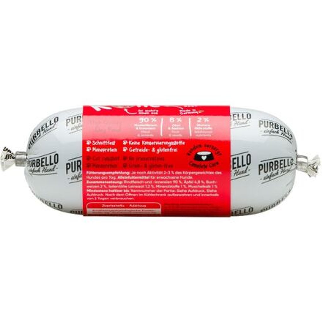 Zdravý a chutný masový salám, který obsahuje 90 % čerstvého hovězího masa, jablka, pohanku a lněné semínko. Zdravý a chutný masový salám, který obsahuje 90 % čerstvého hovězího masa, jablka, pohanku a lněné semínko. Vhodné i pro psy s citlivým zažíváním. Jedná se o kompletní krmivo. PURBELLO je monoproteinové mokré krmivo pro psy vytvořené pro zdravou výživu psů. Díky svému složení s jediným zdrojem živočišných bílkovin, vysokým podílem masa a té správné receptuře je PURBELLO zdravé a vysoce chutné. Krmivo je také velmi dobře stravitelné a vhodné i pro psy s citlivým zažíváním. PURBELLO: - monoproteinová receptura - snadné dávkování - vysoký podíl masa – žádná moučka - pouze čerstvé maso, zelenina a ovoce - bez obilovin - bez lepku - bez umělých přísad - bez konzervačních látek - vyrobeno v Německu Složení: hovězí maso a hovězí vnitřnosti 90%, jablko 4,8%, pohanka 2%, lněné semínko 1,2%, minerály 1%, vápenec 1% Analýza: hrubé proteiny 12,7%, hrubé tuky a oleje 3,8%, hrubé popeloviny 2,8%, hrubá vláknina 0,7%, vlhkost 74% Nutriční doplňkové látky: vitamin D3 (3a671) 224 IU, železo (3b106) 18 mg, mangan (3b504) 3 mg, zinek (3b606) 16 mg, jód (3b202) 0,84 mg, selen (3b801) 0,03 mg  Doporučené dávkování: pes - 5 kg: 100 – 150 g denně, pes - 10 kg: 200 -300 g denně, pes - 20 kg: 400 - 600 g denně a pes - 30 kg: 600 – 900 g denně. Krmnou dávku přizpůsobte váze, věku a aktivitě psa. Zajistěte psovi dostatek pitné vody. Datum minimální trvanlivosti a číslo šarže najdete na zadní straně obalu. Krmivo skladujte suchu. Po otevření skladujte v lednici a co nejdříve spotřebujte.