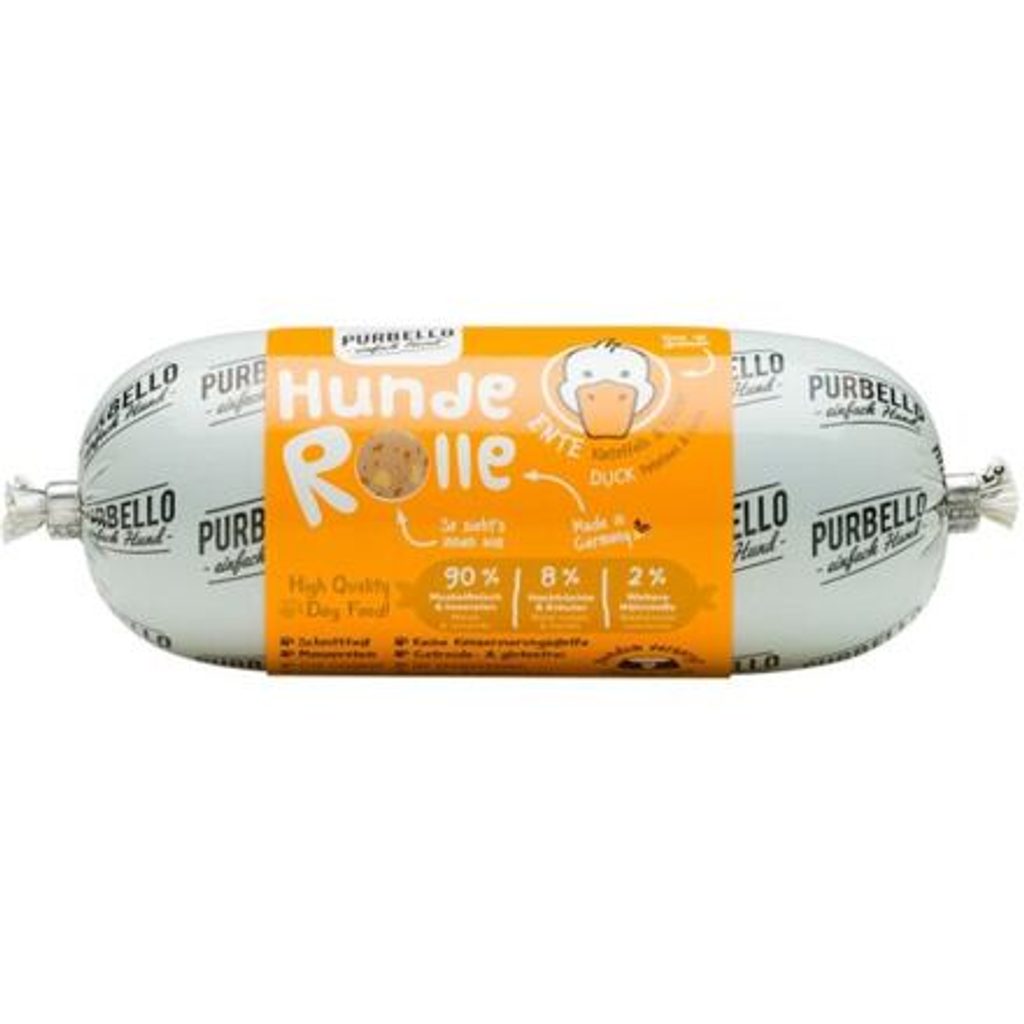 Zdravý a chutný masový salám, který obsahuje 90 % čerstvého kachního masa, brambory a bylinky. Zdravý a chutný masový salám, který obsahuje 90 % čerstvého kachního masa, brambory a bylinky. Vhodné i pro psy s citlivým zažíváním. Jedná se o kompletní krmivo. PURBELLO je monoproteinové mokré krmivo pro psy vytvořené pro zdravou výživu psů. Díky svému složení s jediným zdrojem živočišných bílkovin, vysokým podílem masa a té správné receptuře je PURBELLO zdravé a vysoce chutné. Krmivo je také velmi dobře stravitelné a vhodné i pro psy s citlivým zažíváním. PURBELLO: - monoproteinová receptura - snadné dávkování - vysoký podíl masa – žádná moučka - pouze čerstvé maso, zelenina a ovoce - bez obilovin - bez lepku - bez umělých přísad - bez konzervačních látek - vyrobeno v Německu Složení: kachní maso a kachní vnitřnosti 90%, brambory 5,5%, bylinky 2,5%, minerály 1%, vápenec 1% Analýza: hrubé proteiny 10,8%, hrubé tuky a oleje 14,8%, hrubé popeloviny 3,5%, hrubá vláknina 1%, vlhkost 63,9% Nutriční doplňkové látky: vitamin D3 (3a671) 224 IU, železo (3b106) 18 mg, mangan (3b504) 3 mg, zinek (3b606) 16 mg, jód (3b202) 0,84 mg, selen (3b801) 0,03 mg  Doporučené dávkování: pes - 5 kg: 100 – 150 g denně, pes - 10 kg: 200 -300 g denně, pes - 20 kg: 400 - 600 g denně a pes - 30 kg: 600 – 900 g denně. Krmnou dávku přizpůsobte váze, věku a aktivitě psa. Zajistěte psovi dostatek pitné vody. Datum minimální trvanlivosti a číslo šarže najdete na zadní straně obalu. Krmivo skladujte suchu. Po otevření skladujte v lednici a co nejdříve spotřebujte.