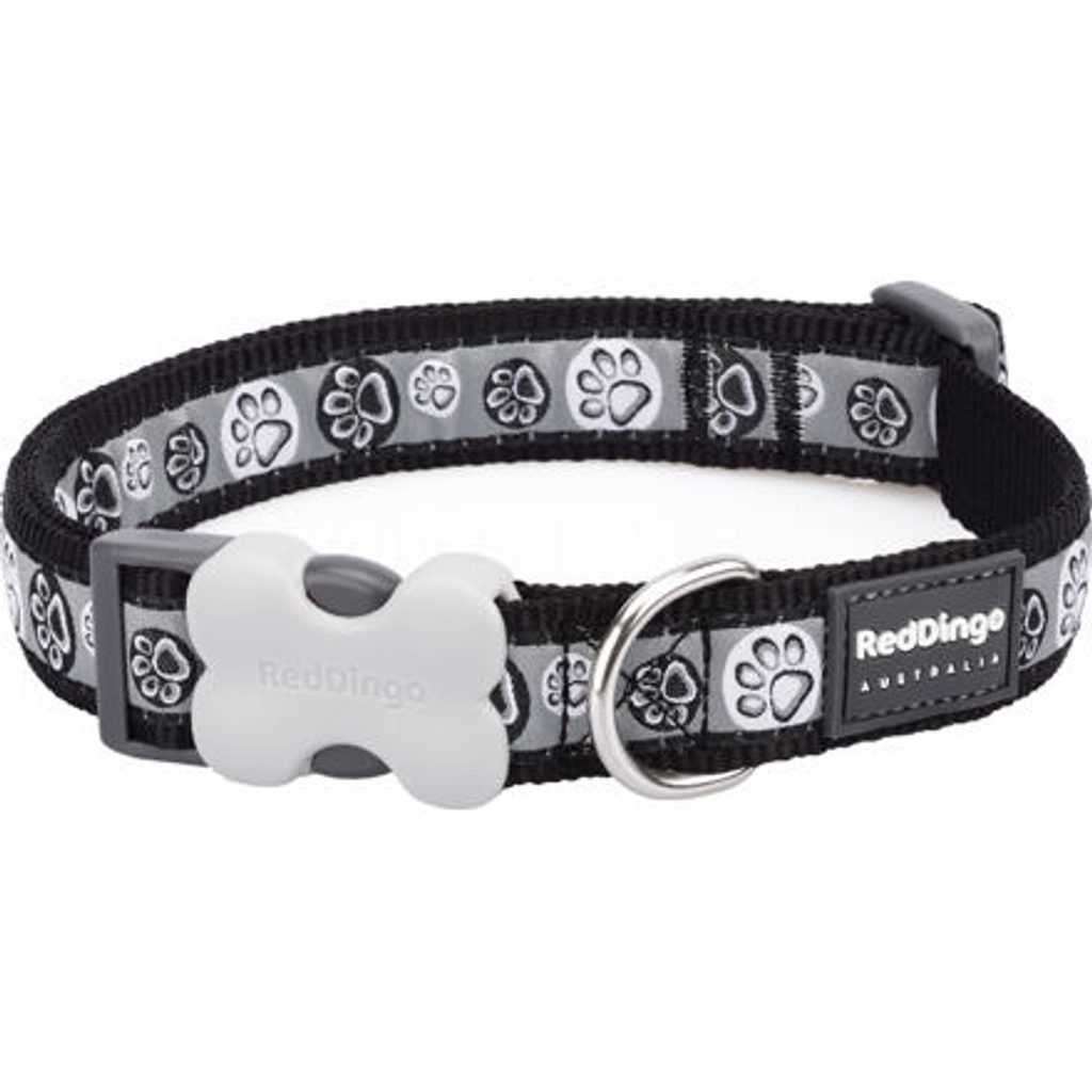 Obojek Red Dingo pro psy s obvodem krku 20 - 32 cm. Šířka popruhu 12 mm. Vzor Paw Impressions Black. Velikost
