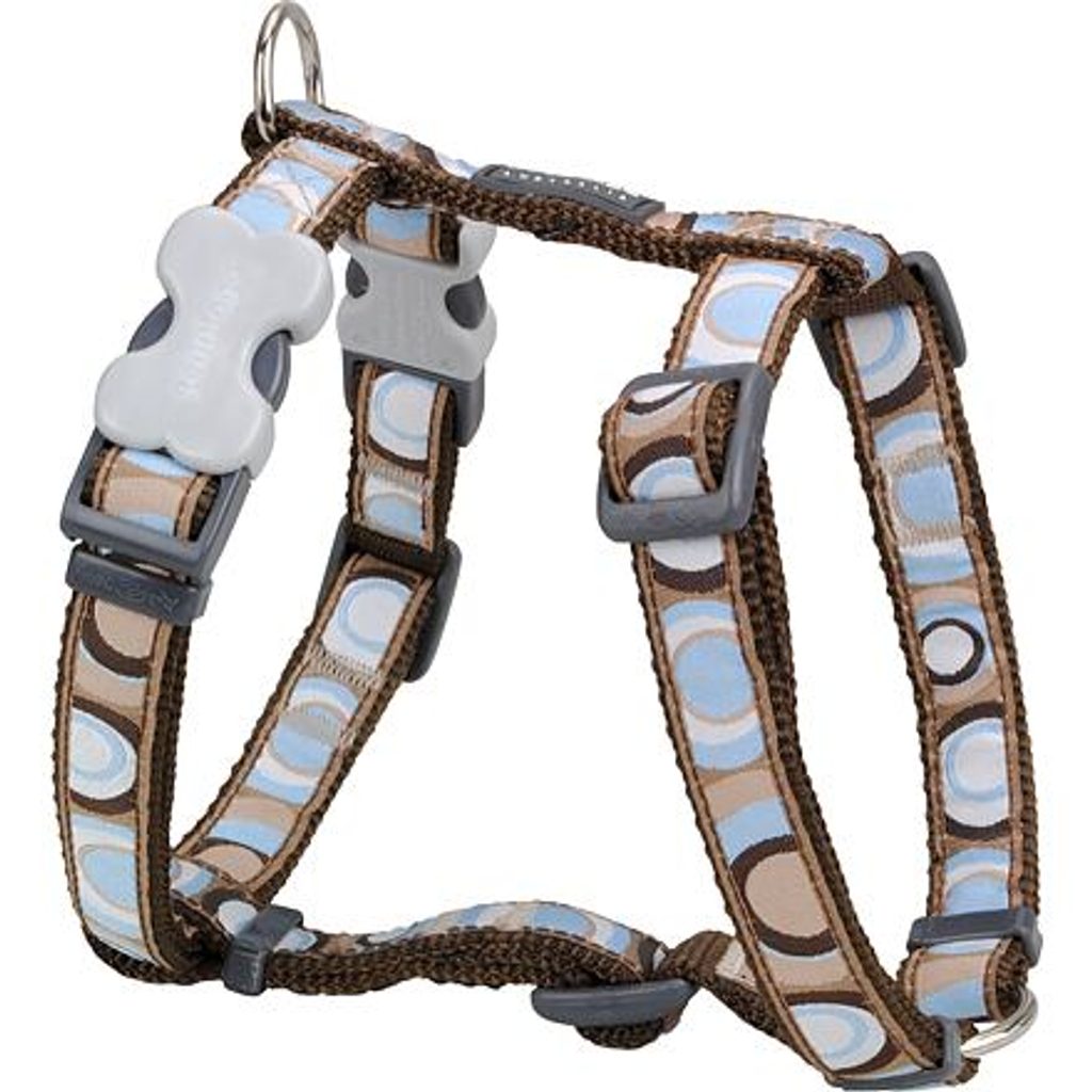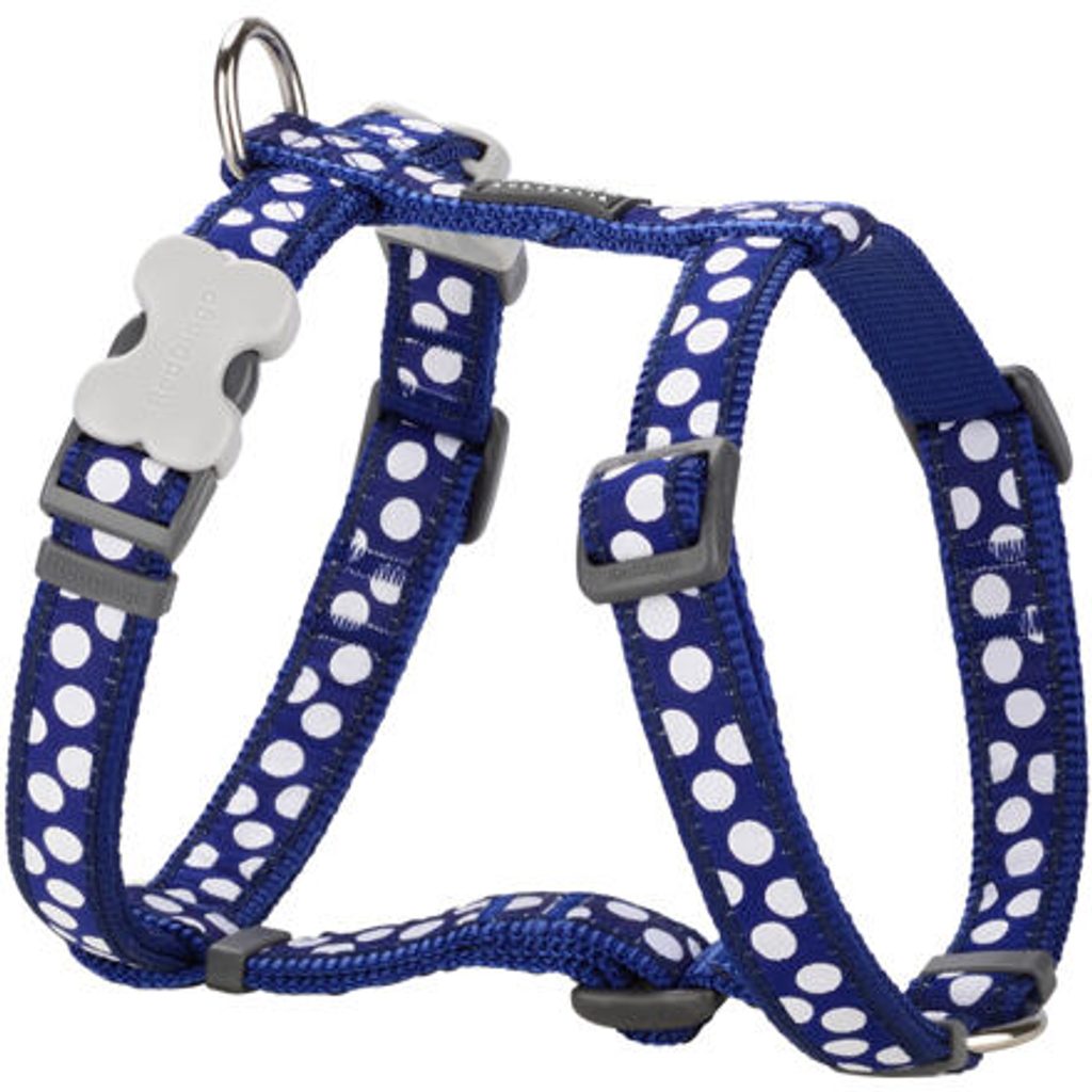 Postroj Red Dingo pro psy s obvodem hrudníku 36 - 54 cm. Šířka popruhu 15 mm. Vzor White Spots on Red. Velikost postroje:
