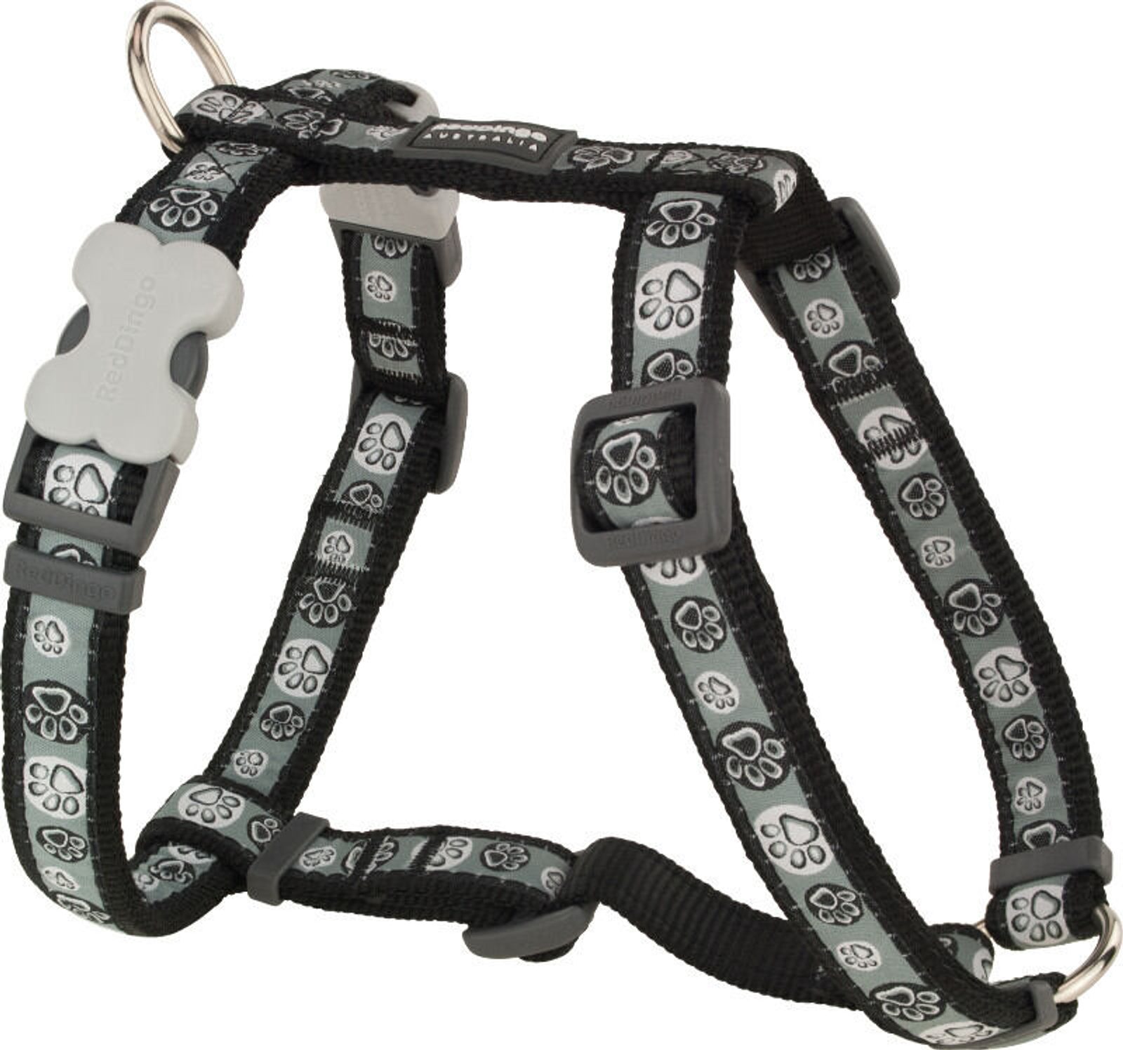 Postroj Red Dingo pro psy s obvodem hrudníku 56 - 80 cm. Šířka popruhu 25 mm. Vzor Paw Impressions Black. Velikost
