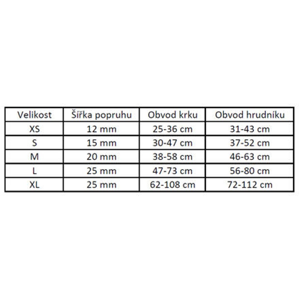 Velikost: obvod krku 47-73 cm, obvod hrudníku 56-80 cm
