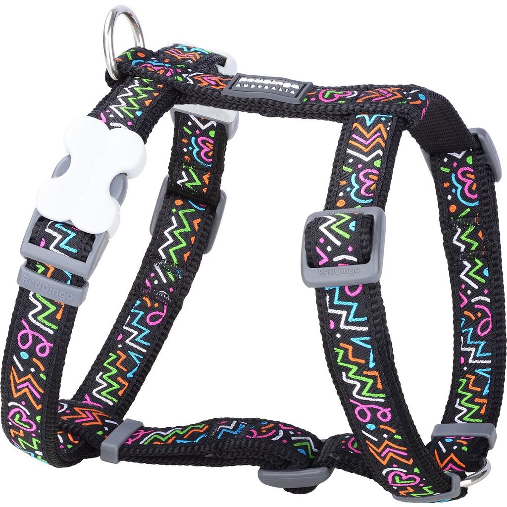 Postroj pro psy s obvodem hrudníku 45-66 cm, s šířkou popruhu 20 mm. Vyroben z kvalitního nylonu, který je extrémně odolný vůči oděru a vyblednutí. S originálními sponami Bucklebone ve tvaru kostiček. Postroj z
