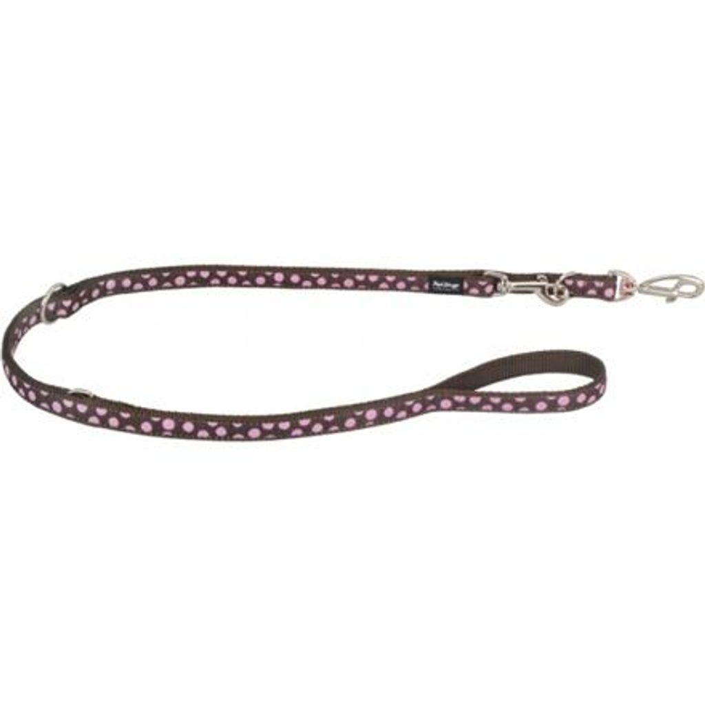 Vodítko Red Dingo pro psy přepínací s nastavitelnou délkou 1,0 – 2,0 m. Šířka popruhu 15 mm. Vzor Pink Spot on Brown. Přepínací