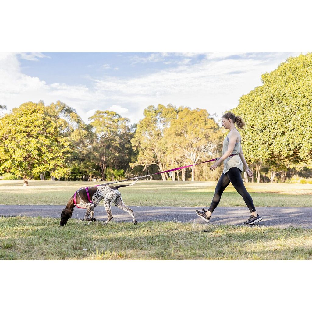Multifunkční vodítko pro aktivní pohyb se psem nabízí několik možností nošení a umožňuje mít obě ruce volné. S nastavitelnou délkou 1,5-2,2 metru, pružnou gumou pro tlumení nárazů a polstrovaným madlem pro rychlou kontrolu. Pastelově zelená barva. Vodítko Red Dingo SuperLead Running je navrženo pro aktivní pohyb – skvěle poslouží při běhu, turistice, ale i při každodenních svižných procházkách. Vodítko lze používat mnoha způsoby – nosit jej můžete pohodlně kolem pasu, přes rameno nebo navléknuté přímo na ruce. Díky hands-free systému můžete mít obě ruce volné a psa přitom stále bezpečně pod kontrolou. V případě potřeby lze psa rychle zajistit připnutím vodítka ke sloupku či plotu. Vodítko je vybaveno posuvným systémem, který umožňuje intuitivní změnu délky vodítka v rozmezí 1,5-2,2 m. Díky tomu můžete dát psovi více volnosti při běhu, ale v případě potřeby vodítko pohotově zkrátit a mít psa bezpečně u nohy – ideální například při přecházení silnice nebo míjení jiných psů. Pružná guma účinně tlumí nárazy, díky čemuž zvyšuje pohodlí při běhu či svižné chůzi a chrání krční páteř psa. Součástí vodítka je praktické polstrované madlo, které slouží k rychlému uchopení a zajištění maximální kontroly nad psem v rušných situacích. Vodítko je vybaveno pevnou kovovou karabinou, která se dá lehce ovládat jednou rukou, nerezovými kroužky a ikonickou Bucklebone sponou ve tvaru kosti. Nylonový popruh s hustě tkanými okraji vyniká mimořádnou odolností proti oděru a dlouhou životností, takže spolehlivě obstojí i při častém používání. multifunkční vodítko pro psy hands-free systém – nošení kolem pasu, přes rameno nebo na ruce nastavitelná délka 1,5–2,2 m s amortizérem – pružnou gumou, která tlumí nárazy zvyšuje komfort při běhu stop madlo pro okamžitou kontrolu v rušných situacích možnost připnutí ke sloupku/plotu pro krátké zajištění psa nylonový popruh s hustým tkaním – dlouhá životnost, odolný proti oděru Podívejte se na video!