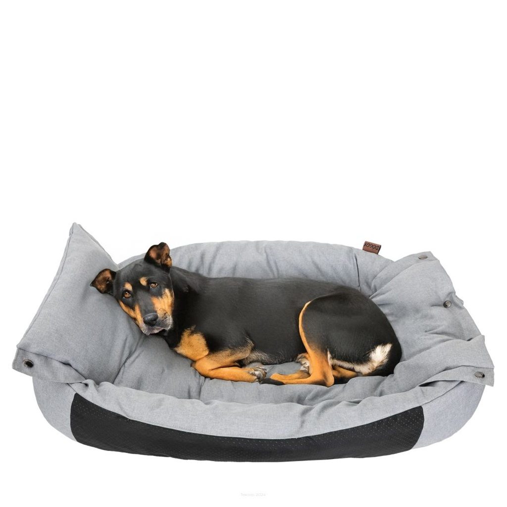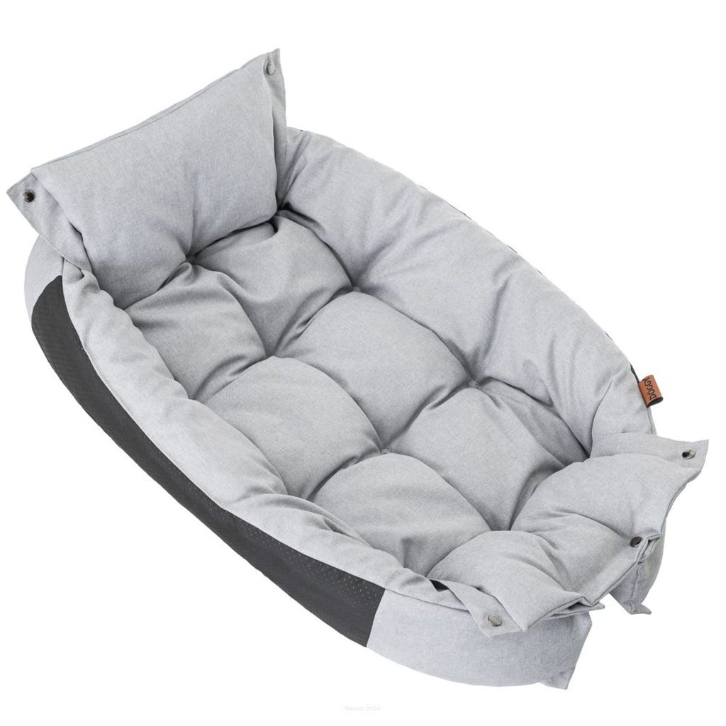 Pelíšek je vyroben z voděodolné tkaniny a má protiskluzové dno, takže zůstává stabilní i na kluzkých podlahách. Oboustranný polštář nabízí dva vzhledy v jednom, zatímco měkké, vysoké okraje poskytují oporu a ochranu před průvanem.