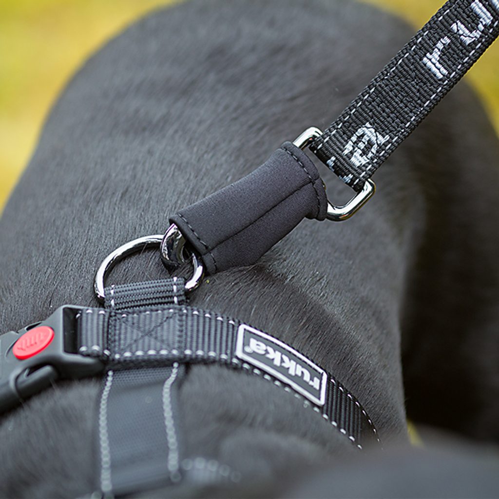 Karabinu lze skrýt pod měkký neoprenový obal, který je součástí vodítka. Krycí návlek z neoprenu chrání záda psa před karabinou a eliminuje nepříjemný zvuk karabiny pohybující se na kroužku obojku či postroje.