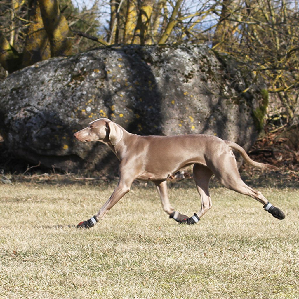 Boty jsou velice pohodlné, ale přesto extrémně odolné, s tvarovanou a ohebnou podrážkou, která nabízí zvýšenou flexibilitu s každým krokem. Boty jsou speciálně ušité, aby se daly snadno nasadit a díky upínacím páskům s reflexními prvky hezky přilnou na psí tlapce. Materiál je odolný stříkající vodě a dešti.