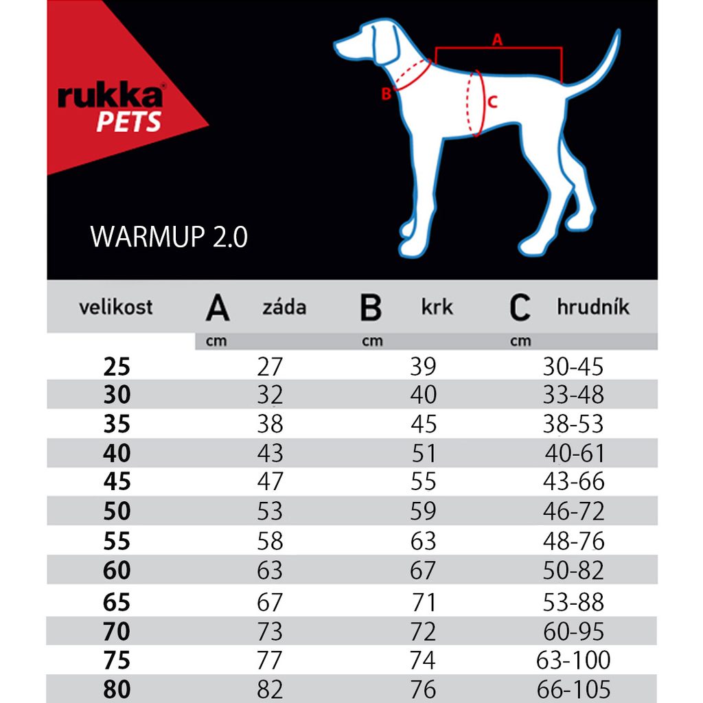 Rukka WarmUp je na špičce technologie v oblékání psů. Vnější tkanina vypadá jako běžná látka, ale má technologicky vyspělé funkční vlastnosti díky membráně. Vnitřní WarmUp vrstva má speciální izolační vlastnosti a svým zpracováním vrstev dělá vzduchovou izolaci. Proto je obleček tak lehký, měkký a poddajný, a přesto tak teplý a vysoce voděodolný.