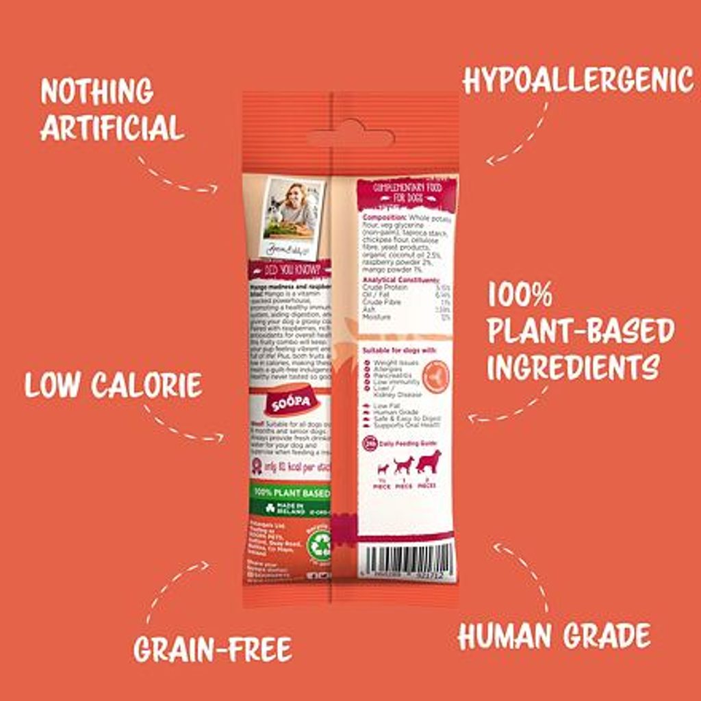 Veganské pamlsky s příchutí maliny a manga – dentální tyčinky pro psy, které pomáhají čistit zuby, masírovat dásně a zároveň potěší každého mlsného chlupáče svou neodolatelnou chutí. 100% přírodní složení bez obilovin a umělých dochucovadel. Dentální