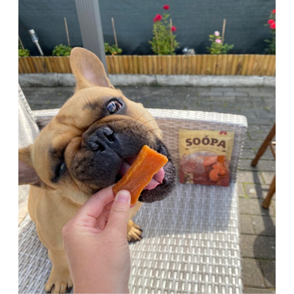 100% přírodní pamlsky pro psy, ručně krájené a šetrně sušené tak, aby si zachovaly maximum živin. Jsou snadno stravitelné a představují přirozený zdroj vitaminů, minerálů a antioxidantů. Mají nízký obsah tuku a neobsahují žádné umělé přísady. Skvělá volba pro zdravé a čisté mlsání. Sušené batáty jsou chutné, zdravé a 100% přírodní pamlsky, vhodné pro psy všech velikostí. Jsou přirozeně sladké a díky postupnému uvolňování energie slouží jako ideální odměna, která pomáhá psovi zůstat aktivní a plný sil po celý den. Jejich žvýkací konzistence při kousání mechanicky čistí zuby a pomáhá omezovat usazování zubního plaku, čímž podporuje dentální hygienu psa. Nízký obsah tuku z nich dělá ideální odměnu i při kontrole hmotnosti. Batáty patří mezi skutečné přírodní superpotraviny. Přirozeně obsahují fermentovatelné sacharidy a vlákninu, které ve střevech slouží jako potrava pro prospěšné střevní bakterie. Díky tomu podporují rovnováhu střevní mikroflóry a správnou funkci trávení, což ocení i psi s citlivým zažíváním. Jejich sytě oranžová barva ukazuje na přirozeně vysoký obsah karotenoidů, které podporují zdravý zrak a přispívají k dobré funkci imunitního systému psa. Soopa Chews jsou ručně zpracovávané a šetrně sušené tak, aby si zachovaly přirozené živiny i chuť, kterou psi milují. Jejich výroba se řídí podle předpisů Human Grade, což znamená, že celý proces zpracování produktu a jeho skladování probíhá za stejných podmínek jako výroba a skladování potravin určených pro lidskou spotřebu. Díky jednoduchému hypoalergennímu složení bez jakýchkoliv přidaných látek, konzervantů a živočišných bílkovin je lze použít i při eliminační dietě a jsou vhodné pro psy s potravními alergiemi nebo intolerancemi. ručně krájené a šetrně sušené kousky batátů 100% přírodní pamlsky pro psy přirozený zdroj vitamínů, minerálů a antioxidantů bez konzervantů, obilovin, lepku a umělých přísad přirozeně hypoalergenní, snadno stravitelné nízký obsah tuku – vhodné při kontrole hmotnosti vhodné pro všechny psy od 6. měsíce věku Složení: batáty 100 % Analýza: hrubý protein (min.) 4,5 %, hrubé oleje a tuky (min.) 0,72 %, hrubá vláknina (max.) 2,5 %, hrubá vlhkost (max.) 11,9 %, hrubé popeloviny (min.) 2,2 % Doporučené dávkování: malí psi (do 10 kg) 1 ks za den, střední psi (10-20 kg) 2 ks za den, velcí psi (nad 20 kg) 3 ks za den Množství podávaného pamlsku vždy přizpůsobte hmotnosti, aktivitě a celkové kondici psa. Zajistěte dostatek pitné vody. Soopa Chews jsou vhodné pro psy od 3 měsíců věku; bez dozoru doporučeno od 6 měsíců. K dostání jsou ve třech druzích: Papáju a batáty lze psům podávat i ve vyšším množství, kokos má však detoxikační účinky, proto by měl být podáván pouze v menším množství. Vzhledem k vyššímu obsahu vlákniny se mohou ve stolici objevit drobné nestrávené zbytky, což je běžné a neškodné.