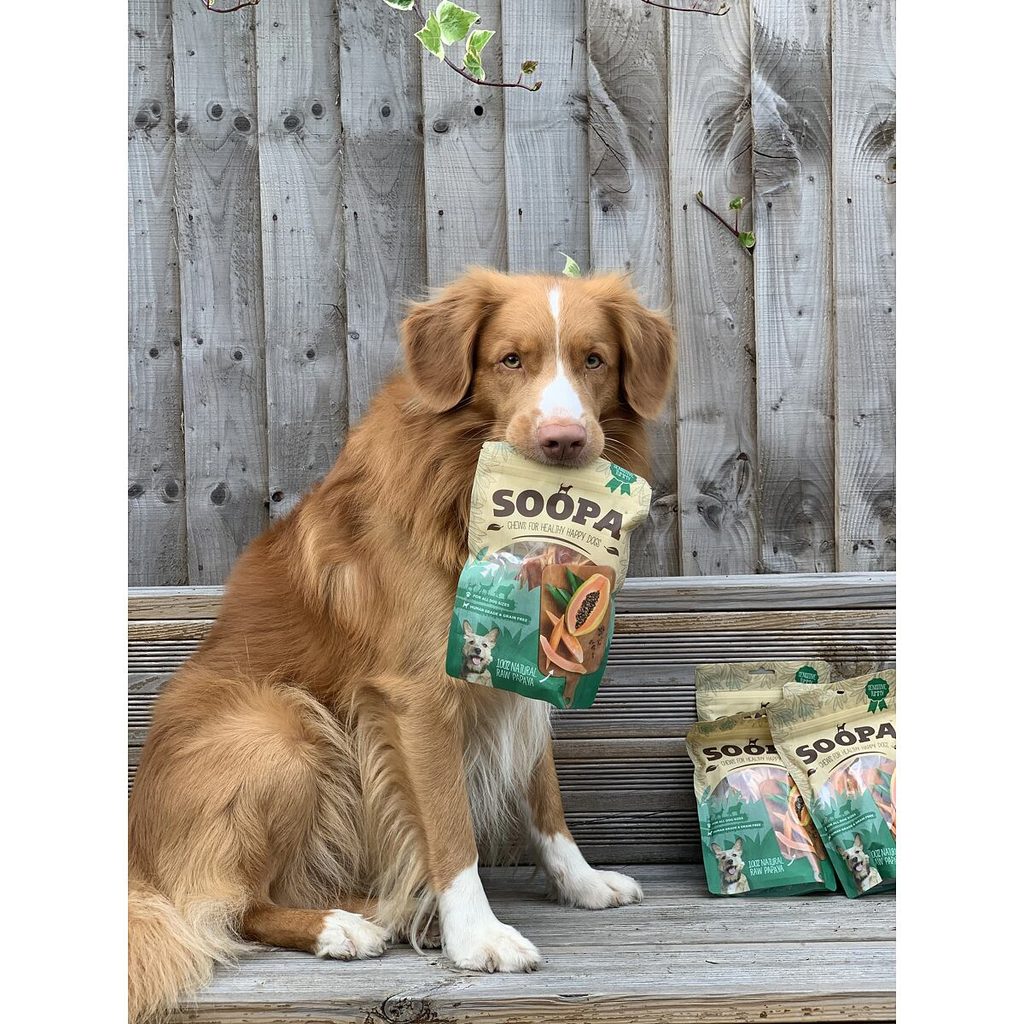 Sušené kousky papáji jsou ručně zpracovávané a šetrně sušené tak, aby si zachovaly maximum živin. Mají nízký obsah tuku, neobsahují žádné umělé přísady a představují snadno stravitelné pamlsky s přirozeně sladkou chutí, vhodné i pro psy s citlivým zažíváním. Sušené kousky papáji představují jednoduché, přírodní a výživné pamlsky, které si psi zamilují pro jejich přirozeně sladkou chuť a žvýkací konzistenci. Papája je ovoce nabité vitaminy, minerály a antioxidanty, které podporují celkové zdraví psa. Obsahuje enzym papain, který pomáhá s trávením bílkovin a uklidňuje tak žaludek při zažívacích potížích. Zároveň má přirozené antiparazitní vlastnosti, které mohou psům pomoci v boji proti střevním parazitům. Jedná se tak o lehce stravitelný pamlsek s nízkým obsahem tuku, který je vhodný i pro psy s citlivým trávením. Zápach z tlamy nemusí vždy souviset se zuby – často má původ v trávicím traktu. Papája pomáhá rozkládat plyny a nepříjemné pachy vznikající v žaludku, a může tak přispět ke svěžejšímu dechu. Soopa Chews jsou ručně zpracovávané a šetrně sušené tak, aby si zachovaly přirozené živiny i chuť, kterou psi milují. Výroba se řídí podle předpisů Human Grade, což znamená, že celý proces zpracování produktů a jejich skladování probíhá stejně jako u potravin určených pro lidskou spotřebu. Díky jednoduchému hypoalergennímu složení bez jakýchkoliv přidaných látek, konzervantů a živočišných bílkovin je lze použít i při eliminační dietě a jsou vhodné pro psy s potravními alergiemi nebo intolerancemi. sušené kousky papáji s přirozeně sladkou chutí 100% přírodní pamlsky pro psy přírodní zdroj vitamínů, minerálů a antioxidantů obsahují enzym papain – podporuje zažívání zpracováváno ručně podle pravidel Human Grade bez konzervantů, obilovin, lepku a umělých přísad snadno stravitelné – vhodné i pro psy s citlivým trávením vhodné pro všechny psy od 6. měsíce věku Složení: papája 100 % Analýza: hrubý protein (min.) 4,27 %, hrubé oleje a tuky (max.) 1,05 %, hrubá vláknina (min.) 5,1 %, hrubé popeloviny (max.) 4,5 %, hrubá vlhkost (min.) 18,4 % Doporučené dávkování: malí psi (do 10 kg) 1/2 ks za den, střední psi (10-20 kg) 1 ks za den, velcí psi (nad 20 kg) 2 ks za den Množství podávaného pamlsku vždy přizpůsobte hmotnosti, aktivitě a celkové kondici psa. Zajistěte dostatek pitné vody. Soopa Chews jsou vhodné pro psy od 3 měsíců věku; bez dozoru doporučeno od 6 měsíců. K dostání jsou ve třech druzích: Papáju a batáty lze psům podávat i ve vyšším množství, kokos má však detoxikační účinky, proto by měl být podáván pouze v menším množství. Vzhledem k vyššímu obsahu vlákniny se mohou ve stolici objevit drobné nestrávené zbytky, což je běžné a neškodné.
