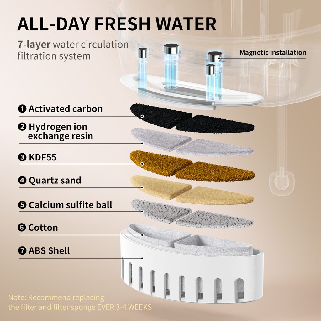 Filtrace je 7-vrstvá, díky čemuž dokonale čistí vodu. Aktivní uhlí a filtrační médium KDF absorbují znečišťující látky, váží na sebe těžké kovy, chlór a jiné nečistoty, které obsahuje kohoutková voda. Iontoměničová pryskyřice změkčuje vodu a zabraňuje ledvinovým kamenům, siřičitan vápenatý odstraňuje chlór a chloraminy, křemičitý písek zabraňuje poškození smyslových orgánů a PP bavlna chrání před parazity a odstraňuje chlupy zvířat. Komplexní filtrační systém tak zajistí dokonalou a vždy čerstvou vodu pro vaše mazlíčky.