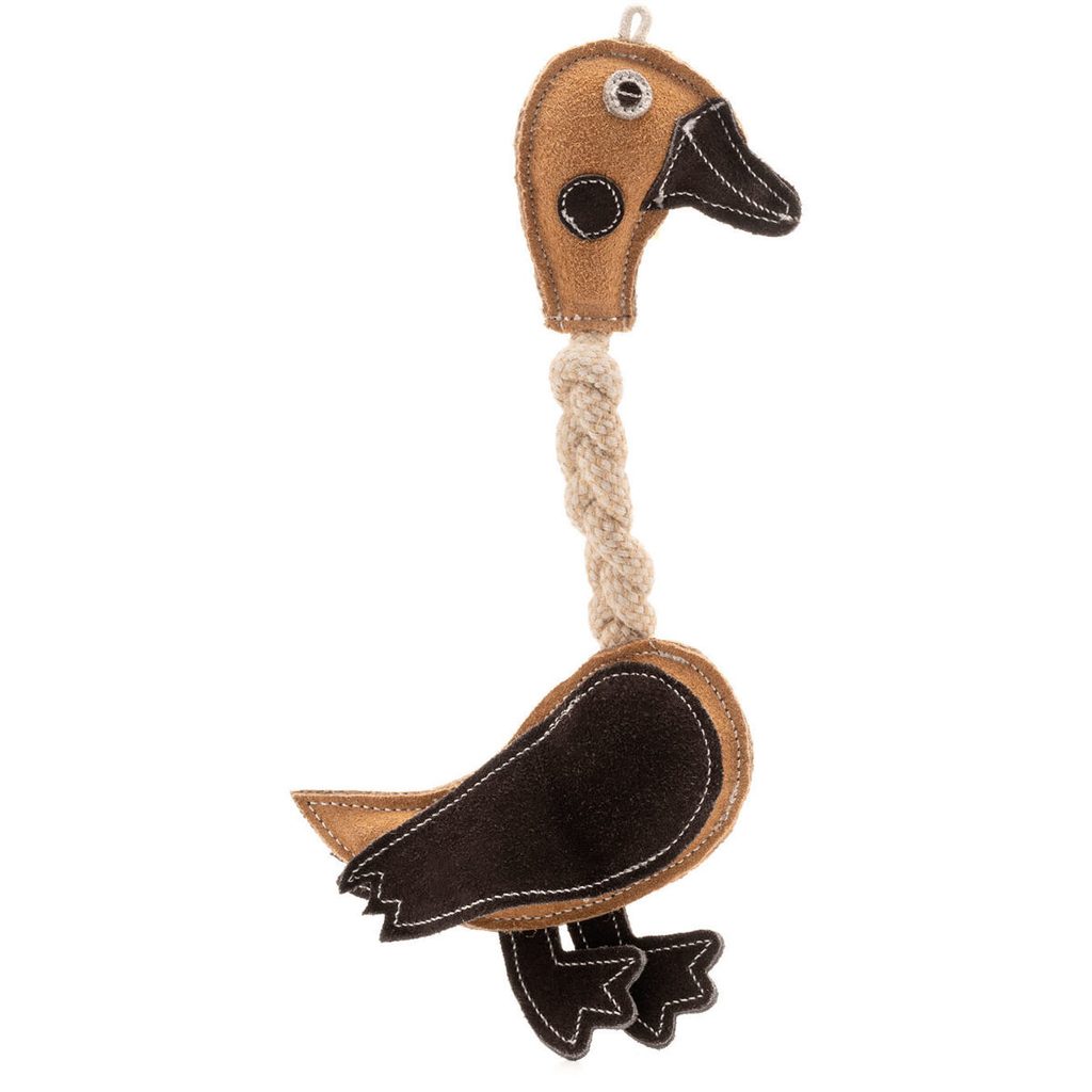 Přírodní hračka s provazem, vyrobena z pravé kůže s výplní z kokosových vláken – ideální pro žvýkání i přetahování. Přirozená vůně kůže probouzí v psovi lovecké instinkty, takže si při hraní užije spoustu zábavy a zároveň naplní přirozenou potřebu lovit a žvýkat. Velikost 26 cm. Wooffee kachna je vyrobena z kombinace přírodních materiálů, které jsou šetrné k zubům a dásním psa a odolávají opakovanému kousání. Tělo je z buvolí kůže s výplní z kokosových vláken a je prošito nití. Nohy jsou z jutového provazu s příměsí bavlny, který je ideální pro kousání i přetahování. Ke hře s ní psa zláká i vůně kůže, která připomíná pach kořisti a vyvolává přirozenou touhu kousat, žvýkat a lovit. Tato hračka je perfektní i pro štěňata, která právě procházejí obdobím přezubování – může pomoci od podráždění dásní, aniž by jakkoliv poškodila křehké zoubky, a umožňuje štěňátkům vybít si jejich přirozenou potřebu kousat na bezpečné hračce, namísto vašich bot nebo nábytku. 100% přírodní hračka s provazem z juty a bavlny vhodná ke žvýkání, přetahování a aportování vyrobena z buvolí kůže s výplní z kokosových vláken přirozená vůně kůže láká ke hře a probouzí lovecké instinkty psa odolná a zároveň šetrná i ke štěněčím zoubkům Na výrobu hraček byla použita kvalitní kůže z buvola, která je jemná a zároveň odolná. Po její úpravě a obarvení byla podrobena testu podle evropské směrnice REACH, která garantuje zdravotní nezávadnost a bezpečnost použitého materiálu. Hračky Wooffee nabízíme v široké škále tvarů, barev a velikostí. Rozmanité detaily na hračkách nejsou jen pro parádu – každý prvek má svůj praktický význam. Uši, ocásky, choboty a výstupky pomáhají psům snadno a zábavně hračku přenášet a žvýkat z různých stran. Některé hračky mají přírodní kokosovou výplň, jiné jsou naopak bez výplně, další mají jutový provaz a některá zvířátka mají z provazu spletené celé tělo – vybere si opravdu každý pes i páníček! Velikost 26 cm