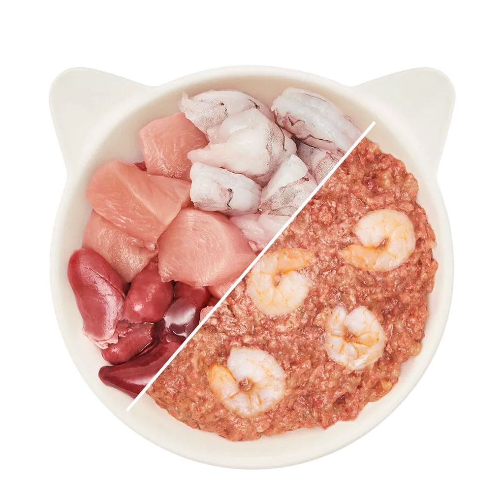 Složení: 70% kuře a krevety (z toho 60% kuře - kuřecí žaludky, kuřecí játra, kuřecí maso, kuřecí srdce, kuřecí krky, kuřecí tuk a 10% krevety), 29% vývar, 1% minerály.