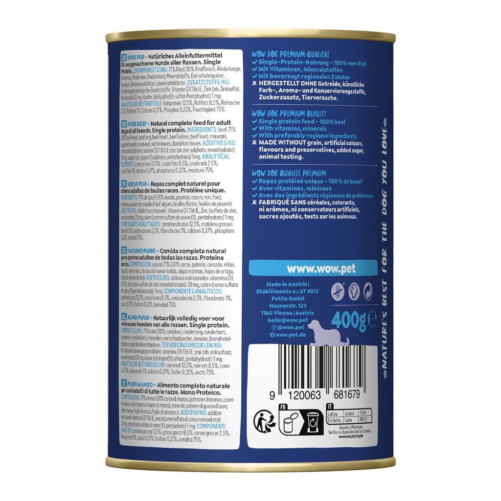 Prvotřídní kvalita s WOW! efektem. Konzervy jsou ručně plněné v rodinné rakouské firmě z místních, většinou alpských, surovin ze zdravé přírody. Stručně řečeno: Přejděte na WOW! Protože WOW efekt si užije váš pes i vaše peněženka! Konzervy WOW mají totiž skvělý poměr kvality a ceny.