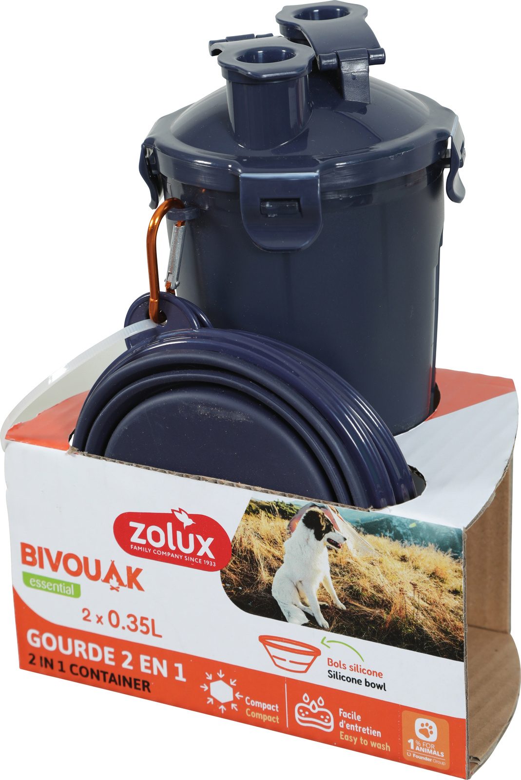 Praktická láhev 2v1 o objemu 350ml s přihrádky na vodu a krmivo pro psy. Má také 2 misky na krmení vašeho mazlíčka kdekoli.